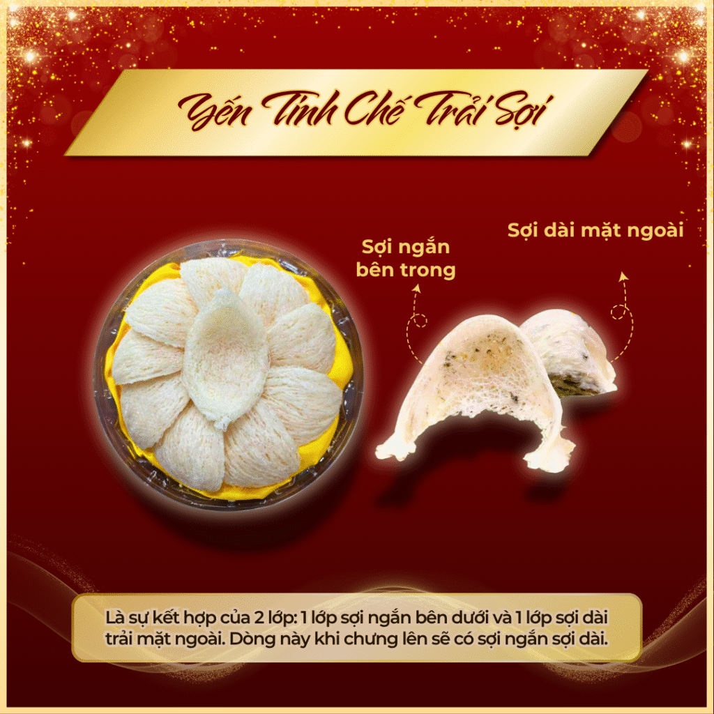 Yến tinh chế Trải Sợi là tổ yến đã được làm sạch và xếp sợi đều tay, giữ nguyên sợi dài tự nhiên. Sản phẩm vừa đẹp mắt, vừa giàu dưỡng chất, giúp bồi bổ cơ thể, tăng sức đề kháng và làm đẹp da. Phù hợp biếu tặng hoặc dùng hàng ngày cho cả gia đình.